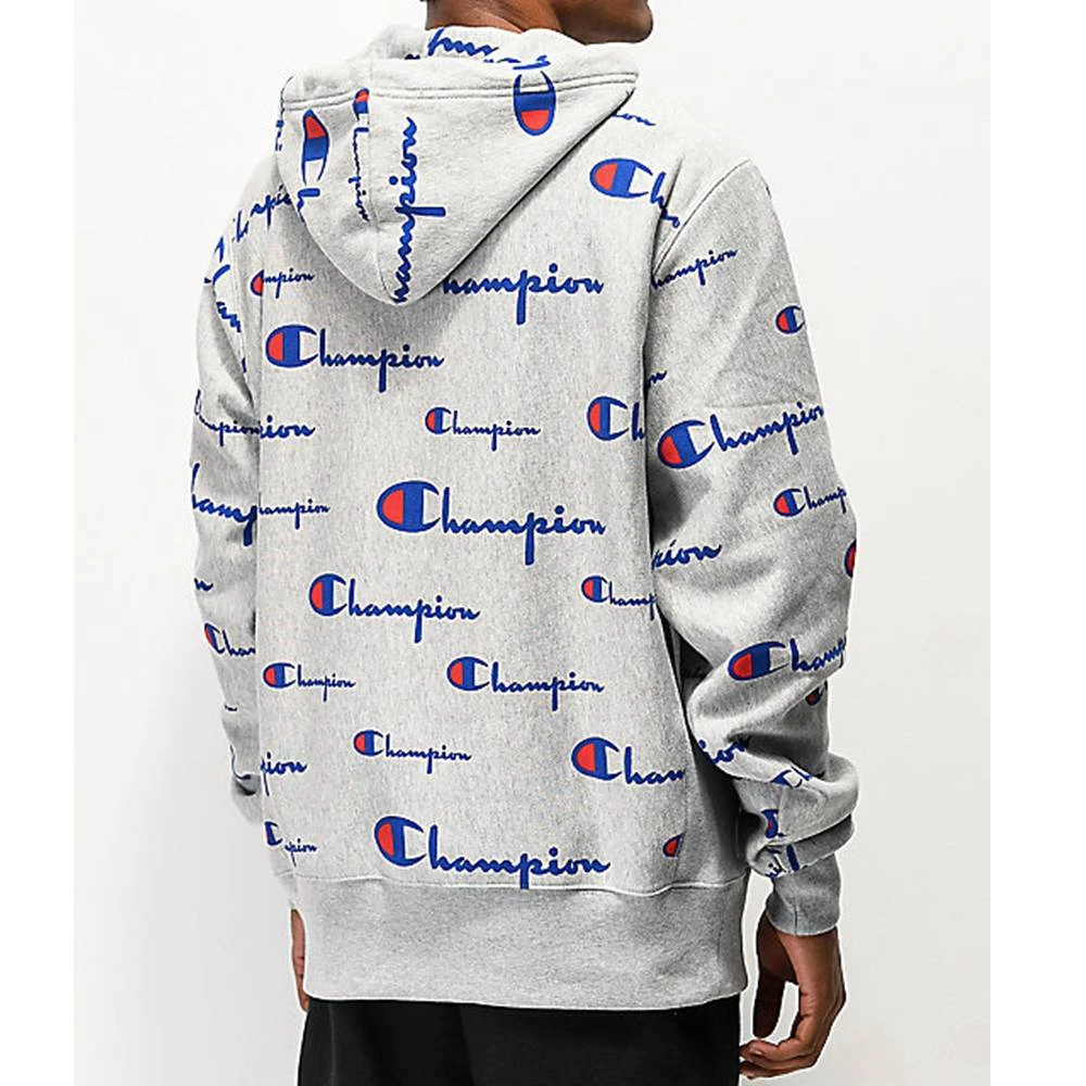 Graphic: Champion hoodie with all over logo script.
