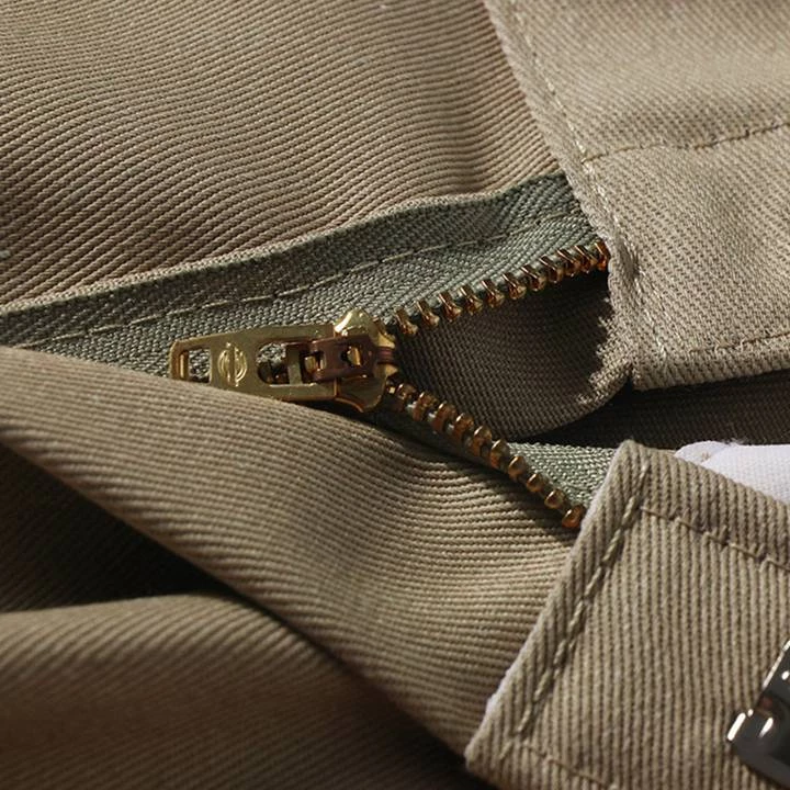 Solid colored, loose fit, twill, work shorts.